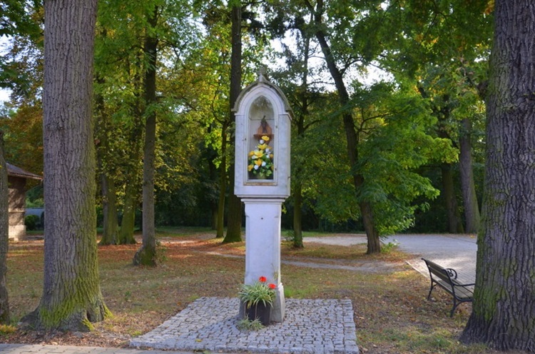 Kapliczka św. Jana Nepomucena stoi na skraju ulicy Szkolnej nieopodal kościoła i cmentarza. Murowana i otynkowana kapliczka zwieńczona ostrym łukiem umieszczona jest na słupie. Jej frontowa ściana posiada wnękę. Wnęka ta również zakończona jest ostrym łukiem i zabezpieczona oszklonymi drzwiczkami. Wewnątrz kapliczki rezyduje św. Jan Nepomucen. Figurka przedstawiająca świętego jet niewielka i stoi na drewnianej półeczce.