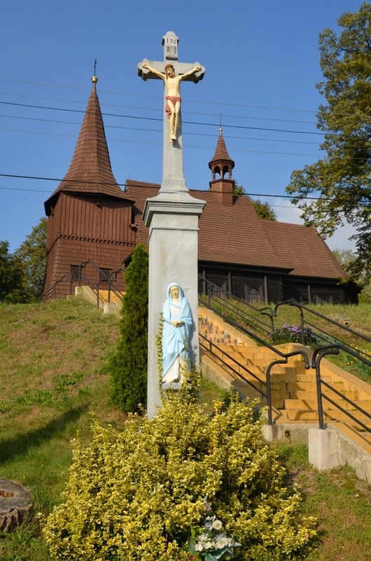Jeden krzyż znajduje się przy schodach prowadzących do kościoła. Został wzniesiony w połowie XIX wieku. Krzyż, którego trzon i ramiona zakończone są w strzałkę stoi na stopce, która z kolei stoi na gzymsie cokołu. Nad figurą ukrzyżowanego Chrystusa kartusz I.N.R.I. Na ścianie frontowej cokołu, na wystającym kamiennym stopniu umieszczona jest płaskorzeźba Matki Bożej. Całość spoczywa na jednoczęściowej podstawie.