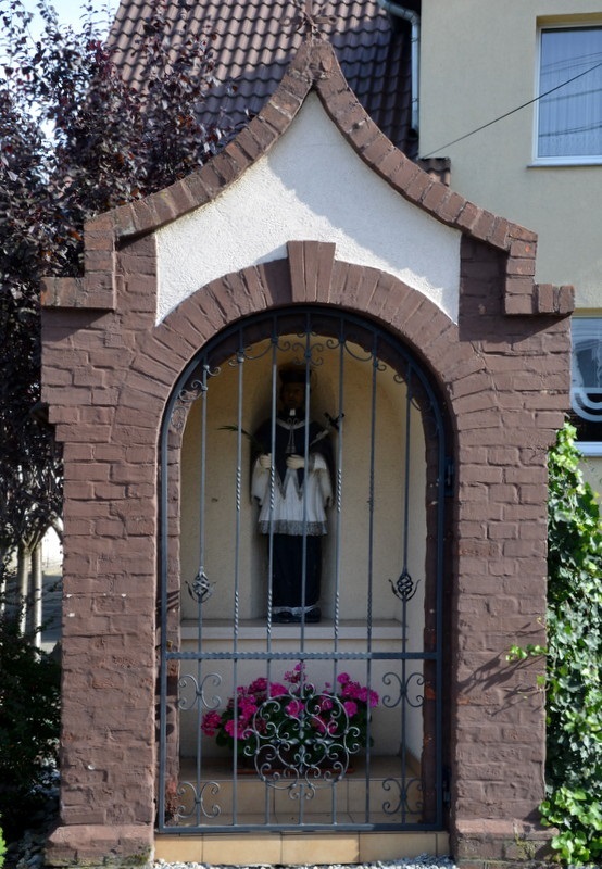 Murowana kapliczka stoi przed plebanią nieopodal kościoła pw. św. Floriana. Do wnętrza kapliczki prowadzi półkoliście zamknięte wnętrze zabezpieczone ozdobną metalową kratą. Wewnątrz kapliczki, we wnęce przyściennego ołtarzyka stoi polichromowana figura św. Jana Nepomucena ubranego w strój kapłański, z aureolą nad głową oraz gałązką palmy w prawej i krzyżem w lewej ręce.