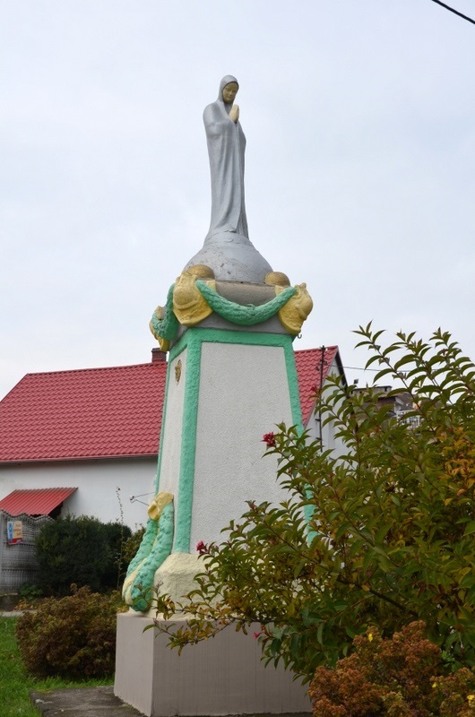 Figura Matki Bożej stoi na masywnym cokole ustawionym na niewielkim skwerku naprzeciwko kościoła pw. Podwyższenia Krzyża Świętego. Trzystopniowy cokół zwężający się ku górze i zakończony ozdobnym gzymsem ustawiony jest na niskiej betonowej podstawie. Na ścianie bocznej cokołu umieszczony jest wieniec laurowy i niewielka płaskorzeźba twarzy Chrystusa. Cokół wieńczy drobna figurka Matki Bożej nakrytej płaszczem i dłońmi złożonymi do modlitwy.