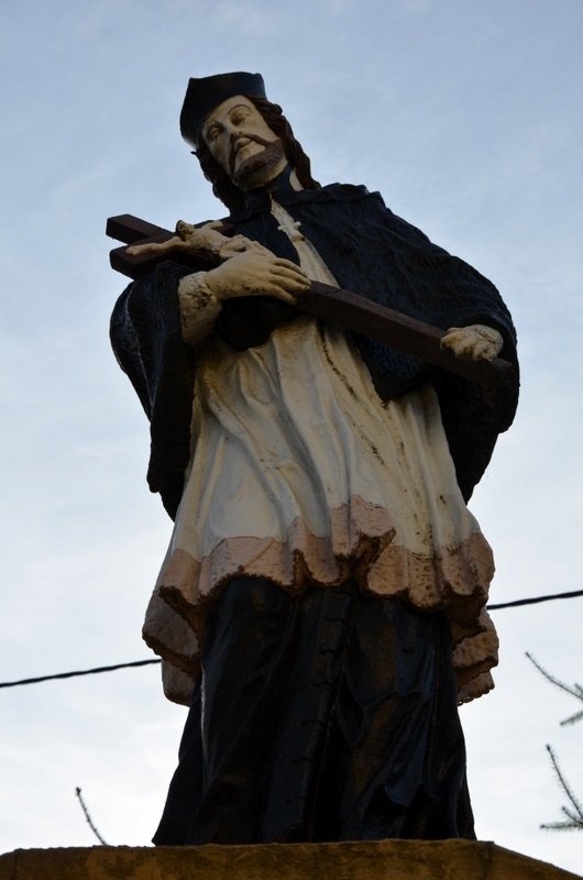 Rzeźba przedstawiająca św. Jana Nepomucena wieńczy dużych rozmiarów baniasty cokół ozdobiony wolutami. Stoi na skraju głównej drogi biegnącej przez wieś, nieopodal kościoła pw. św. Katarzyny Aleksandryjskiej. Rzeźba wykonana z kamienia powstała w XVIII w. Figura przedstawiająca świętego jest polichromowana. Postać stoi w lekkim kontrapoście i adoruje krzyż z figurką ukrzyżowanego Chrystusa trzymanym przy piersi.
