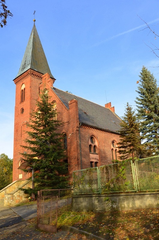 Jest to obiekt murowany z czerwonej cegły i nakryty dwuspadowym dachem. Kilkukondygnacyjna wieża przylega z boku do nawy i nakryta jest ostrosłupowym dachem zwieńczonym krzyżem. Wszystkie prostokątne okna świątyni, wnęki oraz drzwi zwieńczone są półokrągło. Na zachowanym do dnia dzisiejszego kamieniu węgielnym wmurowanym w ścianę kościoła wyryty jest 1899 rok i jest to niewątpliwie rok budowy świątyni. 14.06.1900 roku miało miejsce poświęcenie kościoła. Kościół został zbudowany przez ewangelików i dla ewangelików. Po 1945 r. został przejęty przez katolików.