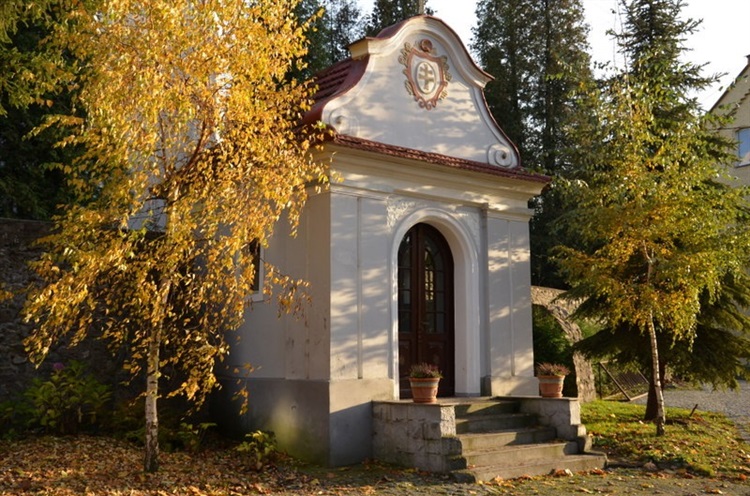 Kapliczka wzniesiona w XVIII wieku znajduje się w murze przed kościołem pw. Wniebowzięcia NMP. Ten obiekt małej architektury sakralnej zbudowany został na planie prostokąta, jest murowany, otynkowany i nakryty dwuspadowym dachem ukrytym za ozdobnym szczytem. Szczyt ozdobionym esownicowymi spływami i wygiętym łukiem wieńczy krzyż. W centrum szczytu wykonany jest kartusz rokokowy z krzyżem bożogrobców. Kapliczka ozdobiona jest parami pilastrów stycznymi z gzymsem biegnącym wokół kapliczki. Ściany boczne posiadają prostokątne półkoliście zamknięte okna. Wejście do kapliczki również zamknięte półkoliście zabezpieczone jest drewnianymi przeszklonymi drzwiami. Wewnątrz w niewielkiej wnęce nad przyściennym ołtarzykiem stoi figurka Matki Boskiej Niepokalanie Poczętej.