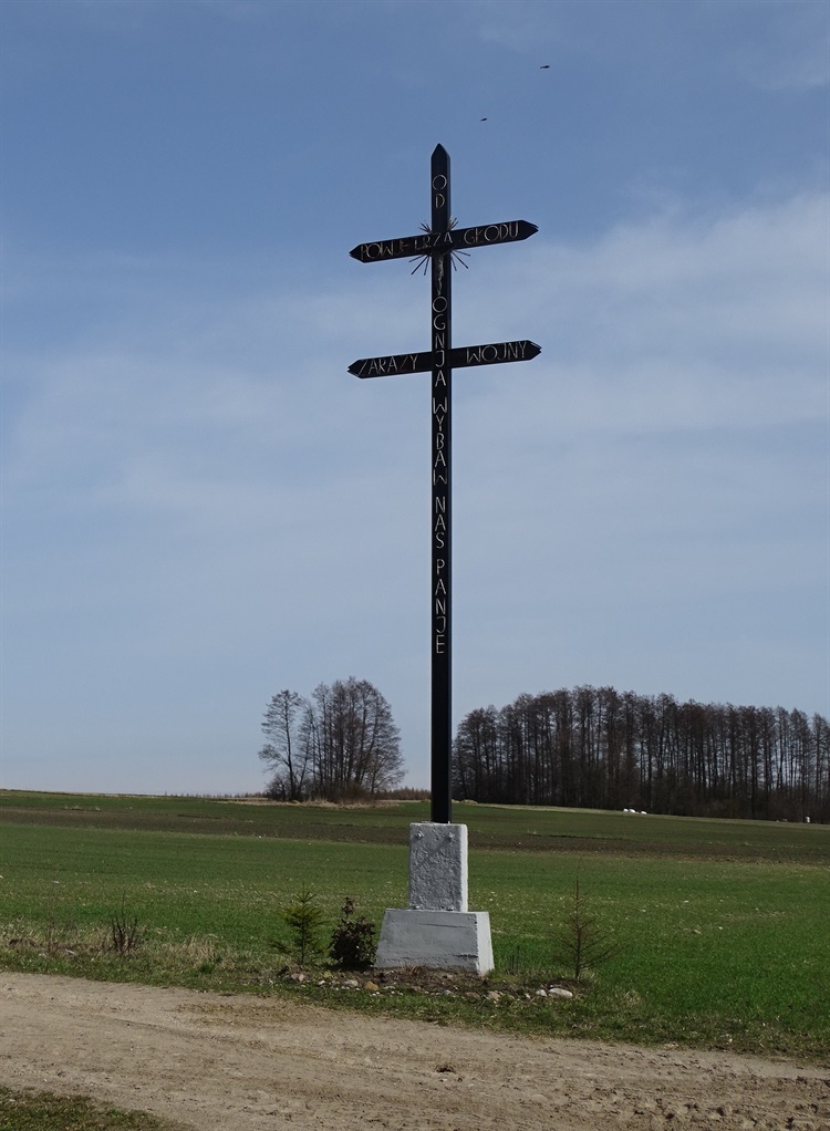Krzyż przydrożny znajduje się przy drodze w niedalekiej odległości od budynku OSP. Na krzyżu z podwójnymi ramionami został umieszczony napis z liter „OD POWIETRZA, GŁODU, ZARAZY I WOJNY WYBAW NAS PANIE oraz figura ukrzyżowanego Chrystusa