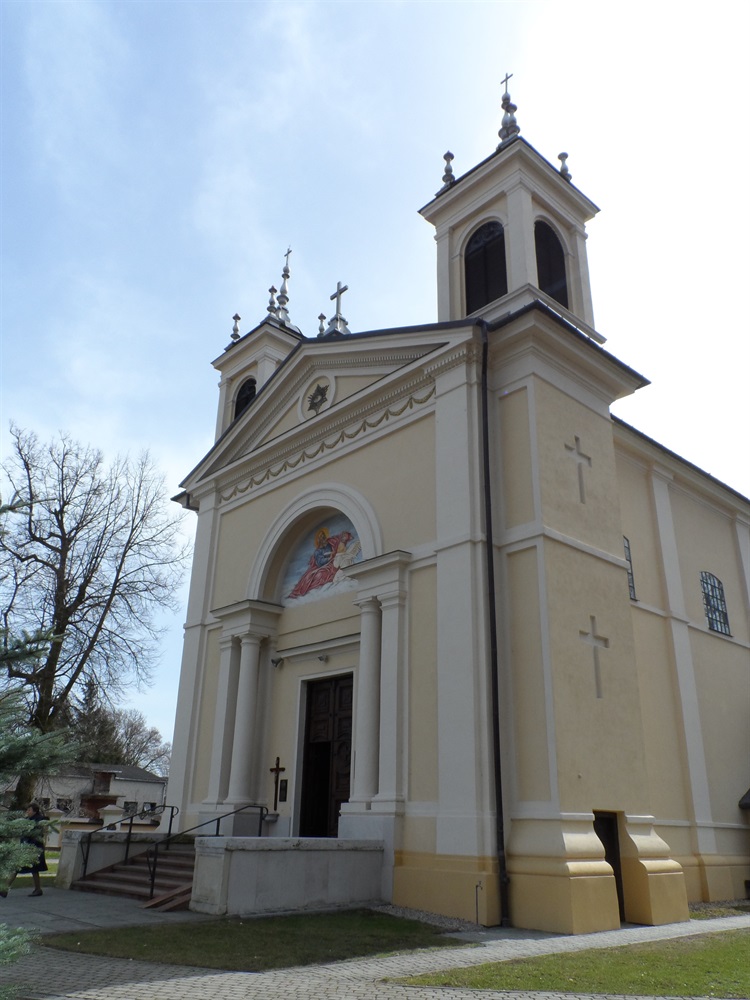 Świątynia została wzniesiona na planie prostokąta z wyższym prezbiterium zwróconym na południe, które zostało zamknięte półkolistą absydą, po bokach znajduje się zakrystia i składzik oraz dwuprzęsłowa nawa. Chór muzyczny został wsparty na dwóch kolumnach i dwóch półkolumnach toskańskich. Zewnętrzna fasada świątyni została rozczłonkowana pilastrami. Szeroki ryzalit został zwieńczony trójkątnym szczytem z okiem Opatrzności w tympanie, natomiast po bokach szczytu znajdują czworoboczne wieżyczki przeprute otworami arkadowymi. Wejście znajduje się we wnęce arkadowej z parą kolumn i pilastrów toskańskich po bokach.