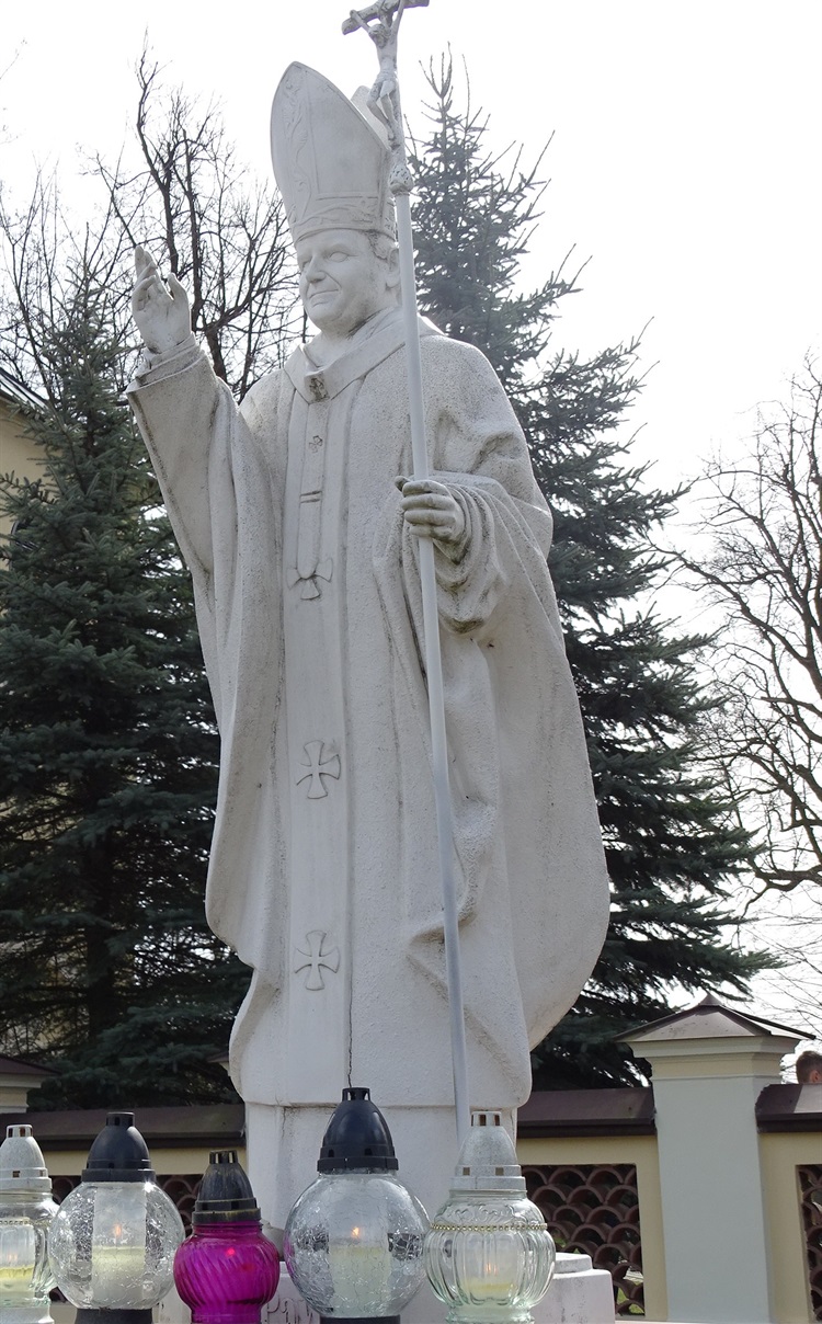 Pomnik Jana Pawła II znajduje się przed bramą kościoła pw. Trójcy Przenajświętszej. Pomnik przedstawia postać papieża Jana Pawła II w szatach liturgicznych z pastorałem i wyciągniętą rękę do błogosławieństwa. Odsłonięcie nastąpiło 3 maja 2007 r.