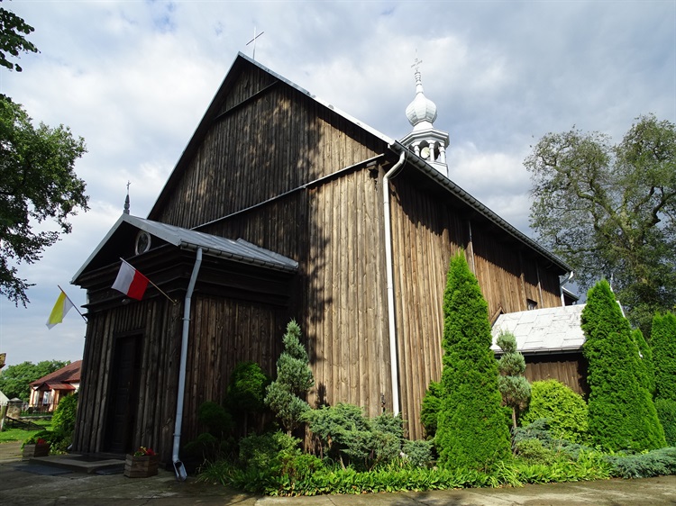W 1521 r. została erygowana parafia przez Jana Łaskiego. Obecna świątynia p.w. Świętych Apostołów Szymona i Tadeusza Judy została wzniesiona w latach 1731-51 r. z fundacji Teodora Potockiego, prymasa Polski, arcybiskupa gnieźnieńskiego. Kościół został wzniesiony z drewna modrzewiowego jako świątynia orientowana, jednonawowa o konstrukcji zrębowej, pokryta dwukalenicowym dachem z ośmioboczną wieżyczką na sygnaturkę zwieńczoną hełmem z latarnią.