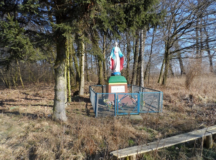 W parku pałacowym, którego ostatnim panem na włościach był Wacław Popiel nad brzegiem stawu stoi do dnia dzisiejszego figura Maryi.