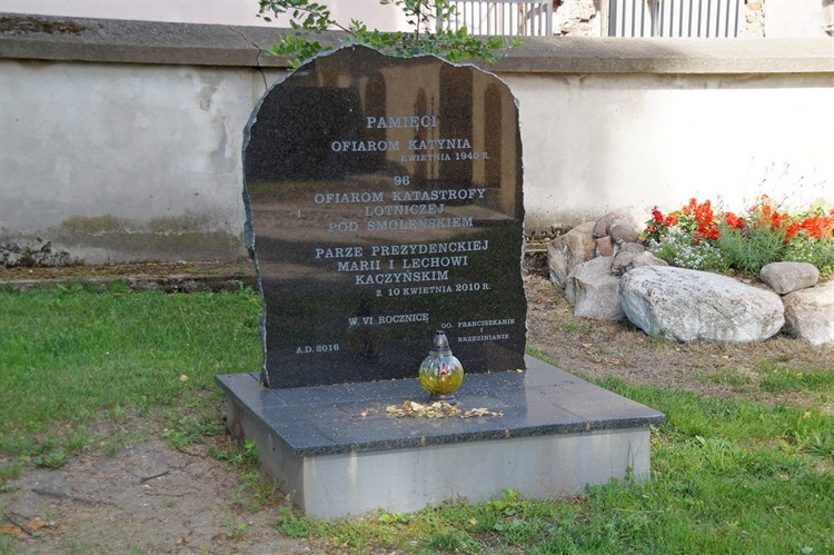 Na placu klasztornym o.o. Franciszkanów znajduje się niewielki pomnik. Upamiętnia on ofiary zbrodni katyńskiej z kwietnia 1940 r. oraz ofiary katastrofy smoleńskiej z 10 kwietnia 2010 r. - 96 osób w tym parę prezydencką Marię i Lecha Kaczyńskich. Pomnik został uroczyście odsłonięty i poświęcony 10 kwietnia 2016 r.