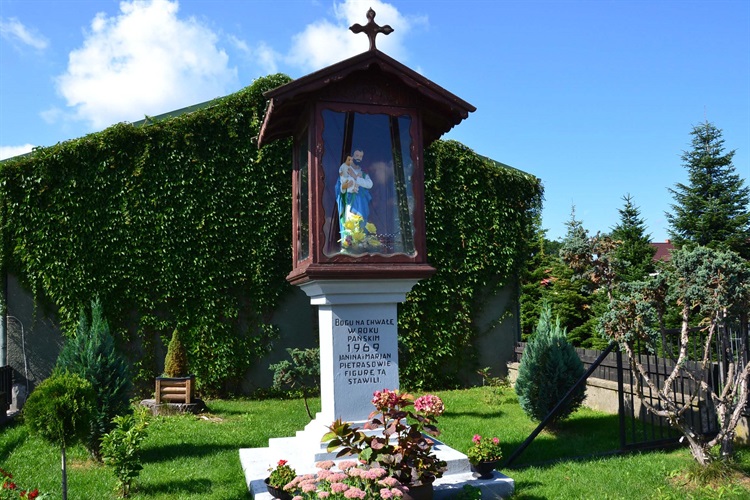Dwusegmentowa, składająca się z czworobocznego postumentu zakończonego gzymsem oraz oszklonego z trzech stron (tył zabudowany) drewnianego domku, nakrytego dwuspadowym daszkiem, nad którym umieszczono drewniany, równoramienny krzyż. W domku nietypowa figura świętego Józefa z Dzieciątkiem Jezus. Nietypowa z dwóch względów. Święty Józef nie dość, że trzyma tu małego Jezusa na prawym ramieniu, to obiema rękami.
