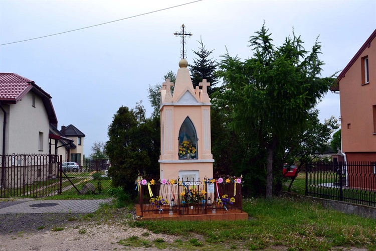 W półkolistej niszy wyższej kondygnacji figura Najświętszej Maryi Panny Niepokalanie Poczętej. W dolnej części tabliczka z treścią: „PAMIĄTKA WSI ZALESIA 1935 R.”