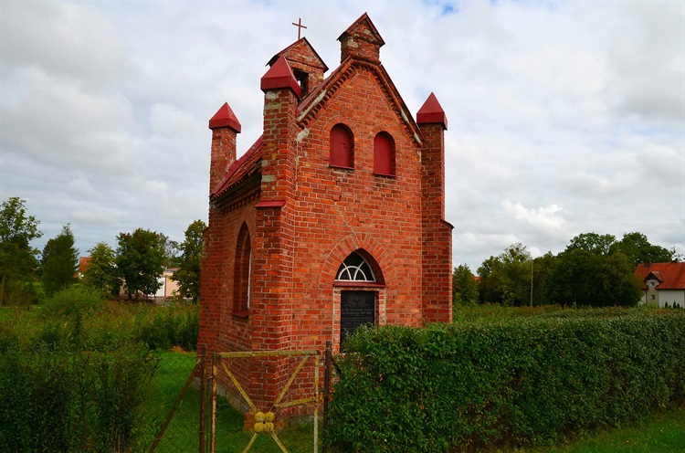 Zwiedzając to miejsce przede wszystkim należy zwrócić uwagę na kaplicę domkową z początku XX w., budowla usytuowana przy południowej drodze wiejskiej owalnicy. Obiekt utrzymany w cechach neogotyku czyli budowla murowana z czerwonej cegły na podmurówce z kamienia, wpisano ją w równoboczny kwadrat. Kaplica pierwotnie posiadała wejście w elewacji południowej, później zostało ono zamurowane i wstawiono marmurową tablicę upamiętniającą poległych podczas I wojny światowej. Tablica ta to lista nazwisk i sentencja patriotyczna: „Für Ihr Vaterland starben im Weltkriege 1914-1918”, co oznacza "Za swoją ojczyznę umarli podczas wojny światowej 1914-1918".