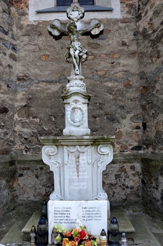 Kamienny krzyż z figurą ukrzyżowanego Chrystusa znajduje się przy zewnętrznej ścianie prezbiterium kościoła pw. Wszystkich Świętych. Ozdobny cokół krzyża zwieńczony wielowarstwowym gzymsem posadowiony jest na dwustopniowym podwyższeniu. W ozdobnej płycinie cokołu w przeszłości wyryta była inskrypcja w języku niemieckim. Niestety napis został zniszczony, pozostawiony został jedynie rok 1814. Zniszczona została również inskrypcja znajdująca się wewnątrz wieńca na ścianie frontowej, na mniejszym cokole ustawionym na wielowarstwowym gzymsie dużego cokołu. Prawdopodobnie pod koniec II – giej połowy XX wieku przed cokołem umieszczona została tablica z inskrypcja w językach polskim i niemieckim o treści "Żałuj człowiecze za swoje grzechy, za które umarłem. Idź i od tej chwili nie grzesz więcej".