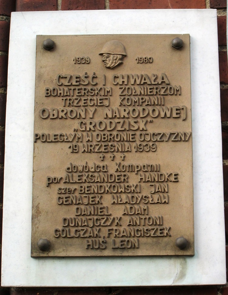 Tablica upamiętniająca bohaterów żołnierzy trzeciej kompanii Obrony Narodowej „Grodzisk” znajduje się na budynku Starostwa Powiatowego przy ul. Żwirki i Wigury 1. Upamiętnia żołnierzy, którzy polegli w dniu 19 września 1939 roku. Na tablicy wymieniono nazwiska siedmiu ofiar. Byli to: por Aleksander Handke, szer Bendkowski Jan, Cenajek Władysław, Daniel Adam, Dunajczyk Antoni, Golczak Franciszek oraz Huś Leon. Tablica ufundowana została w 1989 roku.