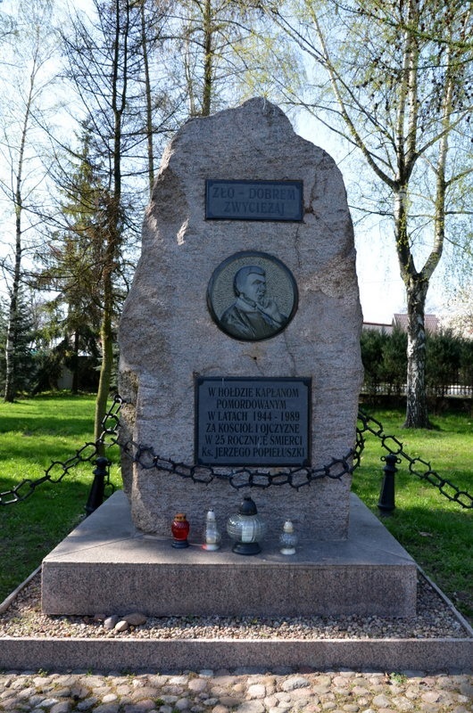 Na terenie zespołu kościelnego stoi pomnik upamiętniający pomordowanych kapłanów w latach 1944 – 1989 za Kościół i Ojczyznę oraz upamiętniający 25 rocznicę śmierci księdza Jerzego Popiełuszki. Informuje o tym tablica inskrypcyjna wmurowana w głaz narzutowy. Powyżej tablicy umieszczony jest w owalnym medalionie wizerunek popiersia ks. Jerzego oraz powyżej tablica o treści "ZŁO DOBREM ZWYCIĘŻAJ".