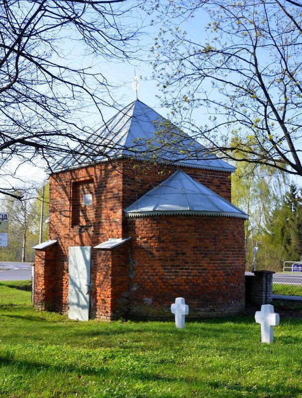 Przy bramie wjazdowej, w rogu cmentarza wzniesiona jest kaplica z czerwonej cegły. Ten mały obiekt zbudowany jest na rzucie kwadratu z dobudowanymi węższymi półkolistymi absydami i niewielkimi przyporami.
