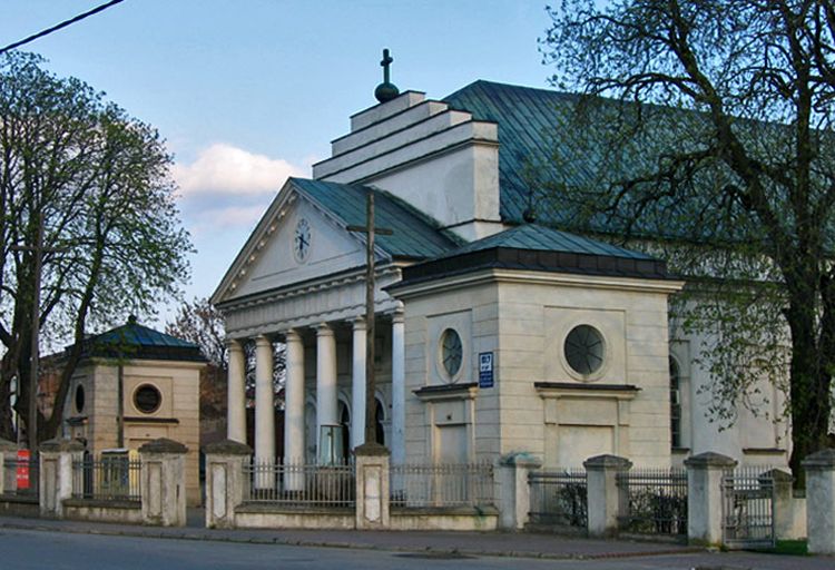 Klasycystyczny kościół został zbudowany w latach 1779-1780 według projektu Szymona Bogumiła Zuga. Sześciokolumnowy portyk z tympanonem tworzy frontową elewację. Przy świątyni stoją dwie dzwonnice wzniesione na planie kwadratu.
