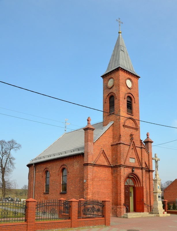Kościół p.w. Najświętszej Marii Panny został wzniesiony w 1905 r. Wzniesiony jest na planie prostokąta, z czerwonej cegły, z półokrągło zamkniętym prezbiterium, wystającą nieco z elewacji frontowej wieżą i dobudowaną z boku do prezbiterium zakrystią. Nawa nakryta jest dachem dwuspadowym, a wieża dachem czterospadowym ostrosłupowym zwieńczonym krzyżem.