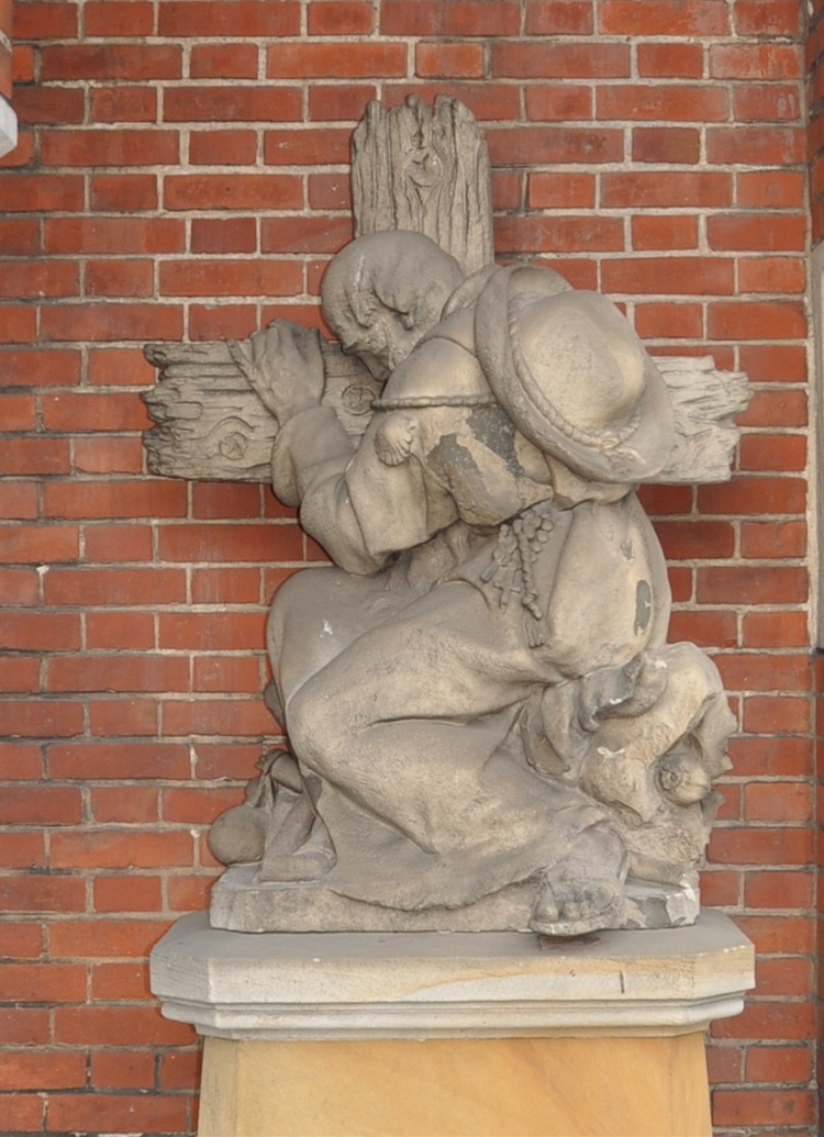 Przedstawiony tutaj stary pielgrzym wspierający się o zmurszały krzyż był tak wymowny, że rzeźbę kopiowano wielokrotnie, tak że w efekcie taki sam pomnik można spotkać na wielu cmentarzach (min. przy kościołach w Brodach czy Uzarzewie). W obecne miejsce "Pielgrzym" został przeniesiony w latach 80. XX w.