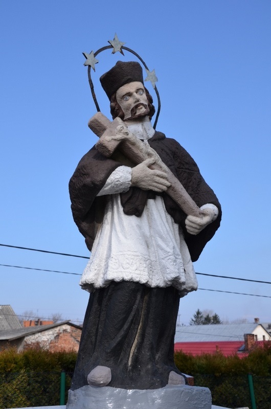 Pierwszą znajdziemy na cmentarzu przy kościele pw. św. Jana Chrzciciela. Kamienna postać świętego datowana na przełom XVIII i XIX wieku wieńczy prosty postument. Jan Nepomucen przedstawiony jest w tradycyjnym stroju z krzyżem trzymanym przy piersi i aureolą nad głową, w której pozostały trzy gwiazdy.
