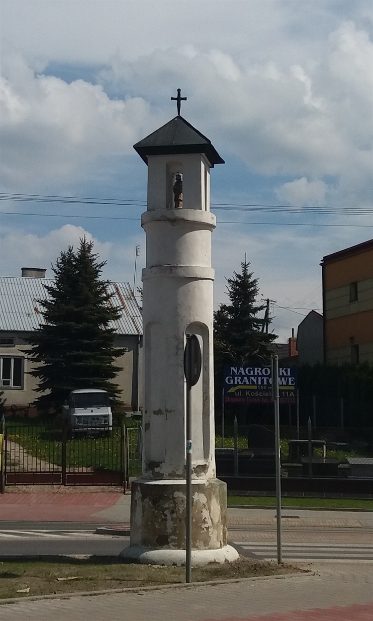 Kapliczka słupowa datowana na koniec XVIII w. Według przekazów ufundowana przez hr.Jezierskiego na miejscu spalonego w czasie potopu szwedzkiego drewnianego kościoła. Prace archeologiczne przeprowadzone w 2016 roku przy przebudowie ulic nie potwierdziły tej legendy, nie znaleziono fundamentów kościoła ale odkryto dawne jamy grobowe. W 2014 w kapliczce umieszczono figurę św. Jana Nepomucena autorstwa artysty plastyka Andrzeja Brodowskiego.