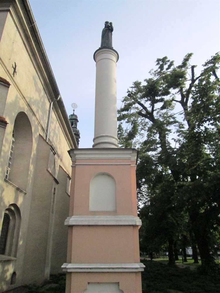 Figura Matki Boskiej z Dzieciątkiem znajduje się przy barokowym kościele pobernardyńskim p.w. Najświętszego Imienia Jezus i Niepokalanego Poczęcia Najświętszej Maryi Panny. Barokowa kamienna figura pochodzi z drugiej połowy XVII wieku. Umieszczona jest na wysokim cokole, ogzymsowanym z wnękami oraz wysokiej okrągłej kolumnie.