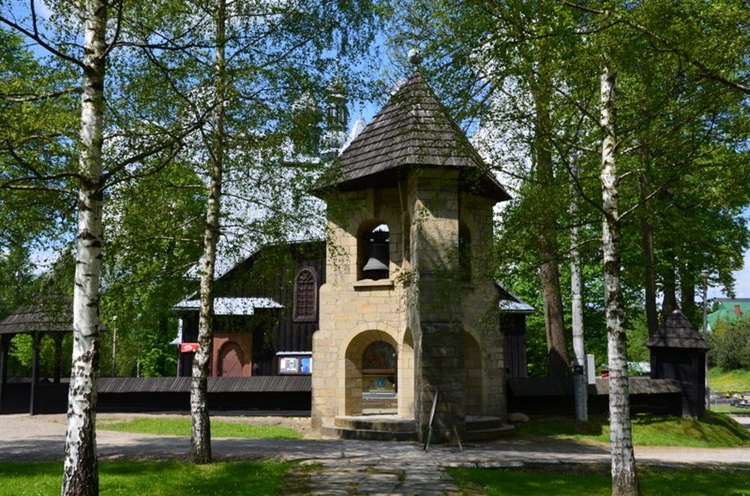 Obok drewnianego kościoła pw. Wszystkich Świętych z 1555 roku stoi murowana dzwonnica. Dzwonnica została wzniesiona w 1930 roku wg projektu prof. Mączyńskiego. Zbudowana jest z kamienia. Przykryta jest czterospadowym dachem gontowym zwieńczonym ażurowym metalowym krzyżem. W roku 1959 została wyposażona w nowe dzwony.