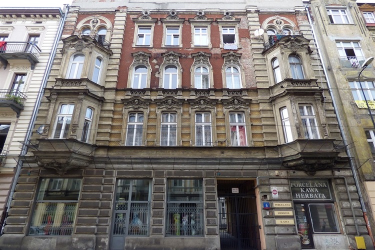 Choć gryziona jest bezlitosnym zębem czasu, to i tak dalej posiada swe architektoniczne piękno. Mowa tu o kamienicy przy ul. Pomorskiej 6 (dawniej ul. Średnia 4). Była własnością Dawida Singera. Plany jej budowy były zatwierdzone w 1896 r. i sporządził je architekt Adolf Zeligson. Podziwiając jej fasadę, potężne i "ciężkie" wykusze balkonowe warto zwrócić uwagę na detale zdobnicze w formie ludzkich głów, która każda z nich jest inna. Kolejnym użytkownikiem nieruchomości było małżeństwo Leiba i Liby Habergritz.