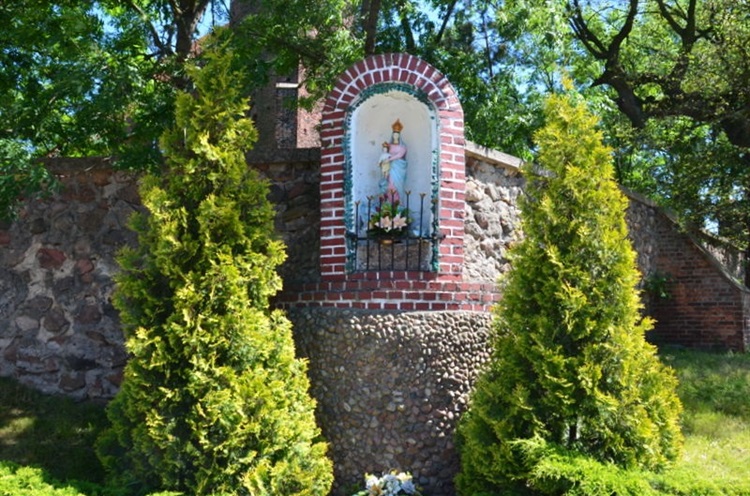 Kapliczka wkomponowana jest w narożu murowanego kamiennego muru otaczającego teren kościoła. Mur wzniesiono prawdopodobnie w XIV wieku w czasie gdy budowano kościół p.w. Wniebowzięcia Matki Bożej lub w pierwszej połowie XVIII wieku podczas jego przebudowy. Kapliczka jest murowana z czerwonej cegły, z wnęką zamkniętą łukiem. Wewnątrz otwartej wnęki zabezpieczonej niskimi ozdobnymi metalowymi drzwiczkami umieszczona jest figura Matki Bożej z dzieciątkiem Jezus.