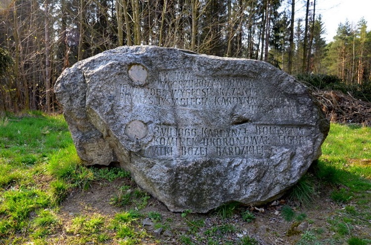 Kamień a właściwie odłam skalny upamiętniający wizyty w Bardzie kardynałów Stefana Wyszyńskiego i Bolesława Kominka ustawiony jest na Wzgórzu Różańcowym naprzeciwko kaplicy Ukrzyżowania. Na jego ścianie wyryte są dwa napisy o treści: "NA TYM WZGÓRZU RÓŻAŃCOWYM 15.VIII.1959 WYGŁOSIŁ KAZANIE PRYMAS TYSIĄCLECIA KARDYNAŁ STEFAN WYSZYŃSKI" i drugi "3.VII.1966 KARDYNAŁ BOLESŁAW KAMIONEK UKORONOWAŁ FIGURĘ MATKI BOŻEJ BARDZKIEJ".