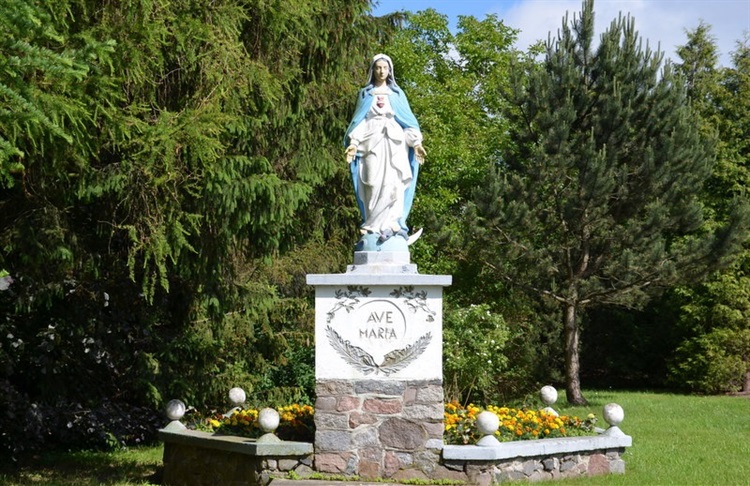 Jedną z nich jest figura Matki Boskiej wieńcząca prosty cokół. Cokół murowany jest z kamienia, z górną częścią otynkowaną i zakończoną gzymsem. W górnej, otynkowanej części cokołu, w okrągłych płycinach ozdobionych motywami roślinnymi wyryte są inskrypcje; AVE MARIA / NIEPOKALANA TOBIE CZEŚĆ / KRÓLOWO POKOJU MÓDL SIĘ ZA NAMI / ANNO DOMINI 1854 – 1954”.