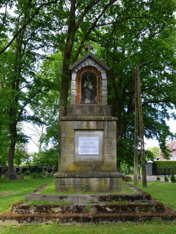 Pierwotnie był to pomnik upamiętniający poległych żołnierzy podczas I wojny światowej. Został odsłonięty 1926 r. a jego twórcą był rzeźbiarz Wilhelm Gross. W płycinach ścian bocznych umieszczone były płyty z wyrytymi imionami i nazwiskami żołnierzy poległych w latach 1914-1918 na frontach wielkiej wojny. W płycinie frontowej ściany znajdowała się inskrypcja w języku niemieckim informująca o przeznaczeniu pomnika. Cokół wieńczyła rzeźba przedstawiająca klęczącego żołnierza, trzymającego w lewej ręce zdjęty z głowy hełm, a w prawej wieniec z liści dębu.