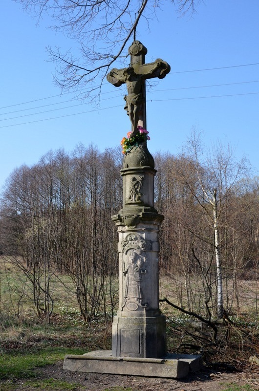 Krzyż stoi na skraju wiejskiej drogi, na wysokim dwustopniowym, ozdobnym cokole, którego podstawa posadowiona jest na dwóch kamiennych płytach. Niestety nieczytelne inskrypcje nic nam nie powiedzą o jego historii, która sięga zapewne początków XIX wieku.