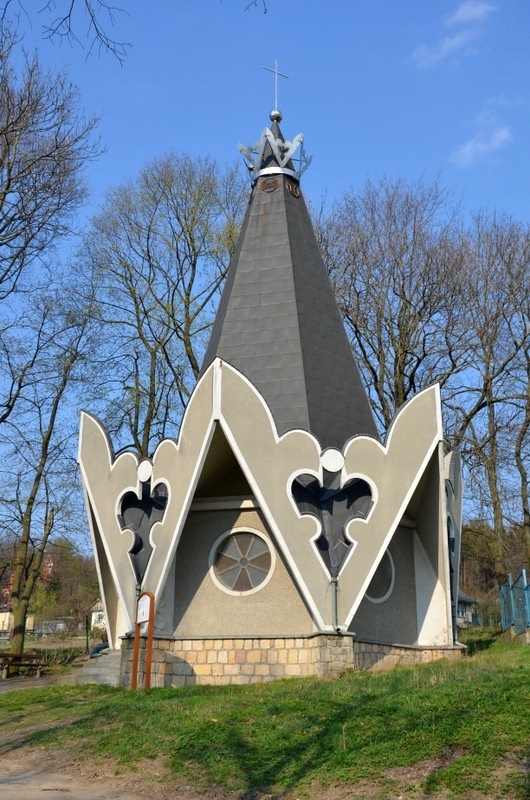 Kaplica została wzniesiona w 1989 roku wg projektu opracowanego przez Ryszarda Maraka z Wrocławia. Swoim wyglądem przypomina koronę ze stylizowanych lilii – dużą koronę nałożoną na podmurówkę oraz drugą, małą, opinającą górną część dachu.