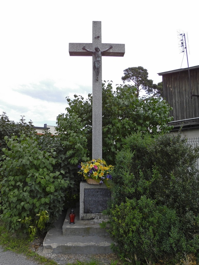 Nie odnalazłem na krzyżu ani płycie daty kiedy został postawiony. Historia natomiast mówi, że postawił go w tym miejscu (za zgodą władz) rozgoryczony mężczyzna po śmierci żony i córki. Najbliższe mu osoby zmarły w wyniku błędu lekarza z pobliskiej przechodni. Pogrążony w smutku mąż i ojciec postanowił postawić krzyż właśnie w tym miejscu aby przejeżdżający tędy doktor zawsze go widział i przypominał mu o tym wydarzeniu.