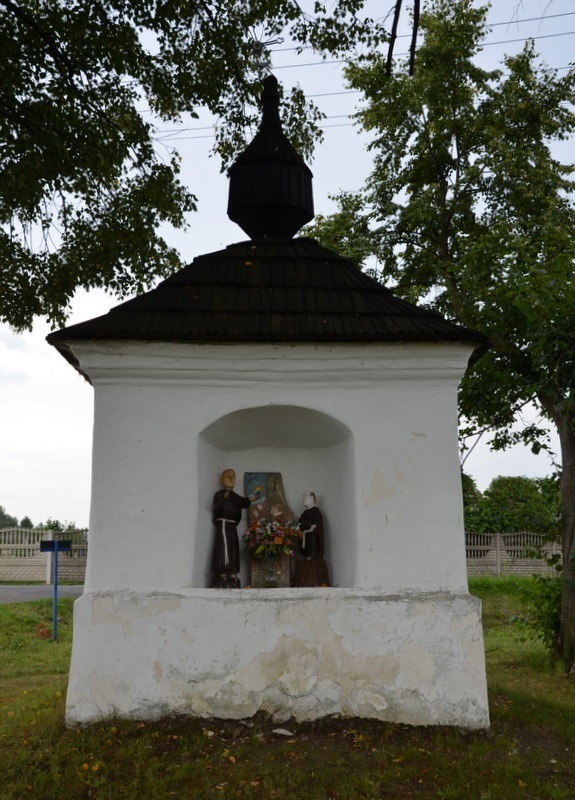 Kapliczka stoi wśród drzew w rozwidleniu ulic Brzozowej i Świętego Jana. Zbudowana jest na planie kwadratu, murowana, otynkowana i pobielona. Nakryta jest dachem czterospadowym krytym gontem i zwieńczonym wieżyczką z krzyżem. Kapliczka na każdej ścianie posiada łukowo zamkniętą wnękę, w których umieszczone są ludowe obrazy i figurki. Nie jest znany wiek jej wzniesienia, prawdopodobnie jest to XIX lub początek XX wieku.