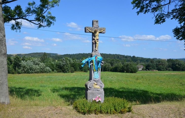 Kamienny krzyż stoi na skraju drogi nr 388 prowadzącej z Polanicy-Zdroju do Wambierzyc. Krzyż z ludową figurą ukrzyżowanego Chrystusa ustawiony jest na gzymsie ozdobnego cokołu posadowionego na podstawie z słabo czytelną inskrypcją. W płycinie cokołu znajduje się płaskorzeźba MB Wambierzyckiej z Dzieciątkiem Jezus, a poniżej leżący baranek. Pod krzyżem umieszczono czaszkę i piszczele.