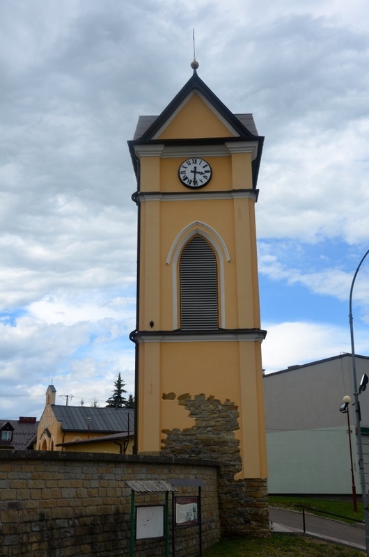 Dzwonnica kościoła p.w. Podwyższenia Krzyża Świętego została wzniesiona w 1891 r. w obrębie murów otaczających teren kościoła. Jest to obiekt zbudowany na planie prostokąta, murowany z kamienia i otynkowany, Wysokość trzykondygnacyjnej dzwonnicy wynosi 15 m. Ozdobiona jest gzymsami oddzielającymi poszczególne kondygnacje, pilastrami oraz gzymsami nad oknami zamkniętymi ostrym łukiem.