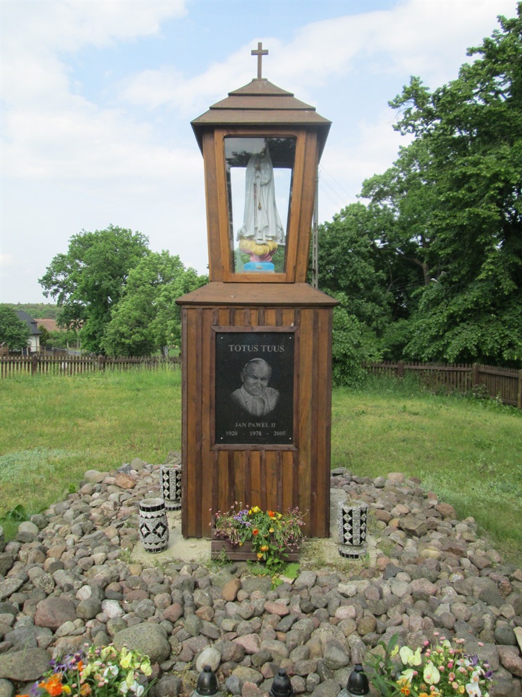Przy kościele p.w. św. Macieja w Trzebicku znajduje się drewniana kapliczka. Jest to kapliczka z figurą Matki Boskiej Fatimskiej umieszczoną w górnej części. Nieco niżej dostrzec możemy trzy tabliczki pamiątkowe. Z przodu tabliczka upamiętniająca papieża Jana Pawła II, natomiast po bokach dwie tabliczki upamiętniające proboszczów tutejszej parafii.