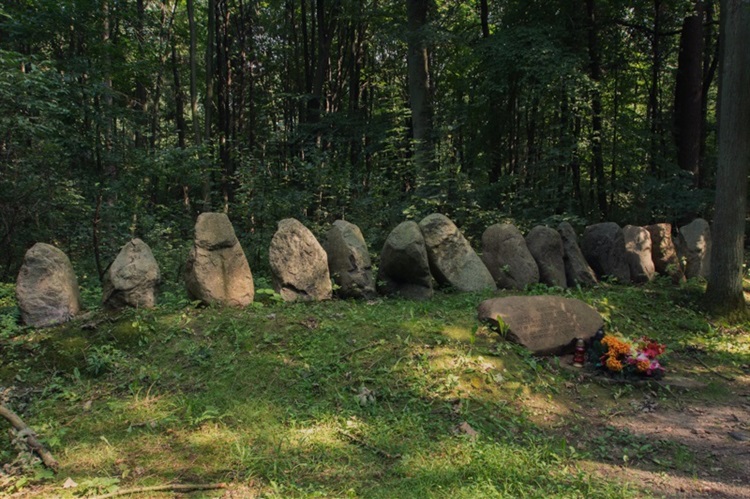 Masowe aresztowania inteligencji łódzkiej rozpoczęły się 7 listopada 1939 r., w ramach dokładnie przygotowanego planu eksterminacji inteligencji polskiej i trwały nieprzerwanie do wiosny 1940 r. W regionie łódzkim aresztowaniami objęto kilka tysięcy osób. Egzekucje wykonywane były zawsze w głębi lasu, nierzadko w nocy i w miejscach pilnie strzeżonych (z ustaleń Komisji Badania Zbrodni Hitlerowskich). Powyższy opis widnieje przy miejscu kaźni, jednak nie do końca jest precyzyjny. Brakuje informacji, że to są symboliczne mogiły pomordowanych - 15 głazów symbolizuje 15 rozstrzelanych. Taka informacja umieszczona jest na obelisku z napisem: "W hołdzie 15 polakom rozstrzelanych przez niemieckich okupantów w tym miejscu w listopadzie 1939 r. Ich prochy spoczywają na cmentarzu w Łagiewnikach"