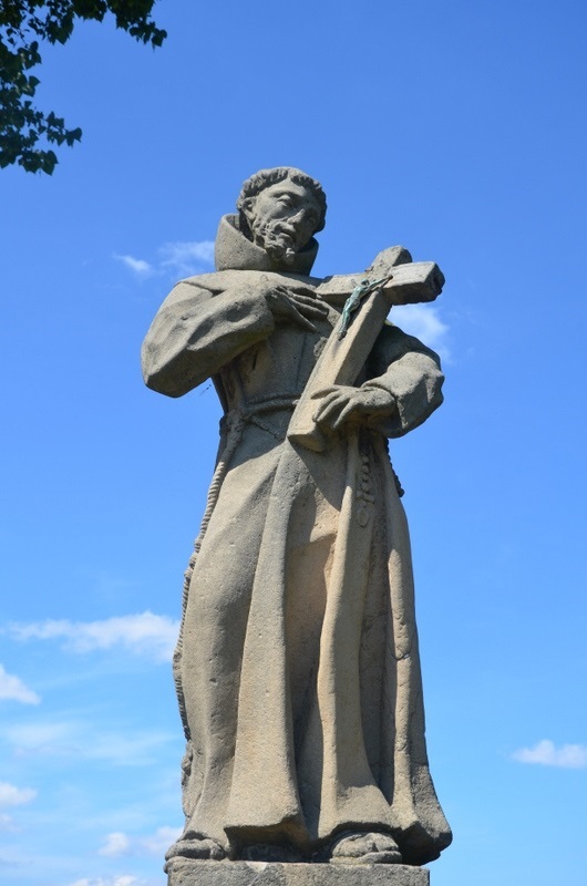 Postać świętego w habicie franciszkanina przedstawiona jest w pozycji stojącej, w kontrapoście i z krzyżem opartym na lewym ramieniu przytrzymywanym lewą ręką. Figura stojąca na tle górzystego pejzażu ziemi kłodzkiej nawiązuje do jego nauk, w których uczył szacunku do przyrody.