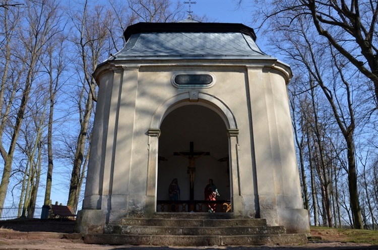 Wnętrze kaplicy wypełnia sklepienie żeglaste. Pierwotnie jej wnętrze zdobiło malowidło z 1885 r. nyskiego malarza Krachwitza. Obecnie w kaplicy pomalowanej na biało umieszczona jest grupa figuralna z końca XIX wieku przedstawiająca Bożą Mękę autorstwa Rueckera z Monachium. Kompozycja składa się z pięciu drewnianych i polichromowanych figur. Centralne miejsce zajmuje ukrzyżowany Chrystus oraz postacie Matki Bożej oraz św. Jana Ewangelisty stojące po obu stronach krzyża. Całość dopełniają postacie dwóch łotrów wiszących na krzyżach.