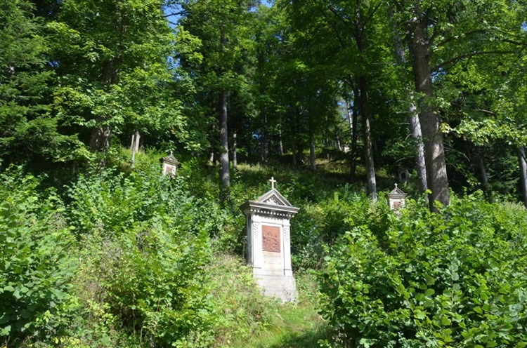 Droga krzyżowa została wzniesiona w 1894 r. na niewielkim zalesionym wzniesieniu u podnóża, którego stoi barokowy kościół św. Jana Nepomucena. Kalwaria została ufundowana przez pustelnika Benedikta Seidela, opiekuna kościoła. Stacje drogi krzyżowej wzniesione są na skraju ścieżki trawersującej stok wzgórza. Poszczególne stacje wykonane są z piaskowca. Cokoły każdej stacji posadowione są na dwustopniowych podstawach i zwieńczone trójkątnymi szczytami. Stacje ozdobione są ząbkami i stylizowanymi ornamentami. W prostokątnych płycinach cokołów umieszczone zostały metalowe reliefy z przedstawieniami scen pasyjnych.