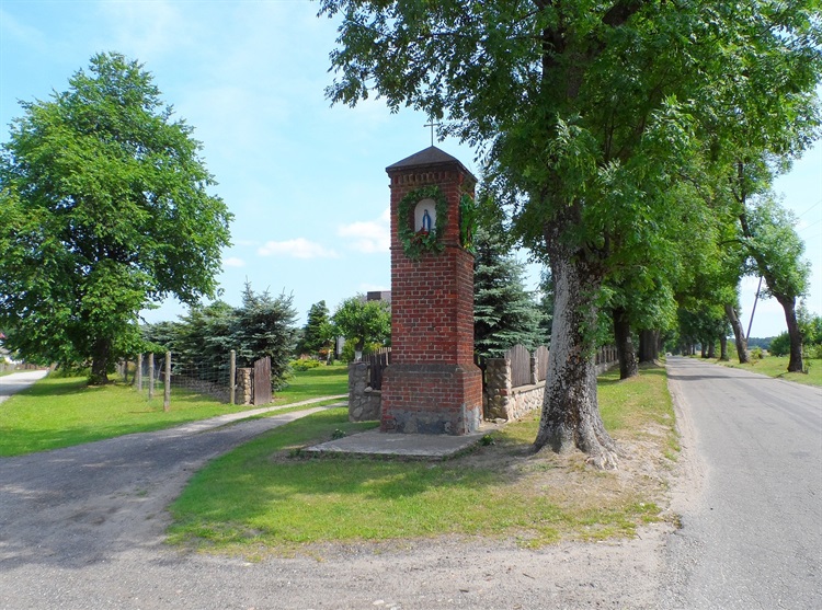 Miłogoszcz wieś w powiecie wałeckim w gminie Tuczno. Na rozstaju dróg stoi ceglana kapliczka słupowa z figurami świętych.