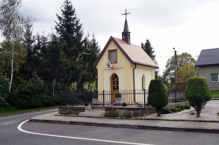 Murowana kapliczka domkowa na planie kwadratu, z dwuspadowym dachem krytym blachą. Na szczycie dachu znajduje się wieżyczka na sygnaturkę, zakończona metalowym krzyżem. Na ścianach szczytowych znajdują się przeszklone wnęki z obrazami, od frontu Matki Boskiej Bolesnej a od tyłu Chrystusa z Sercem Gorejącym. We wnętrzu, nad ołtarzem znajduje się malowidło przedstawiające Pietas Domini. Kapliczka została wybudowana pod koniec XIX w.