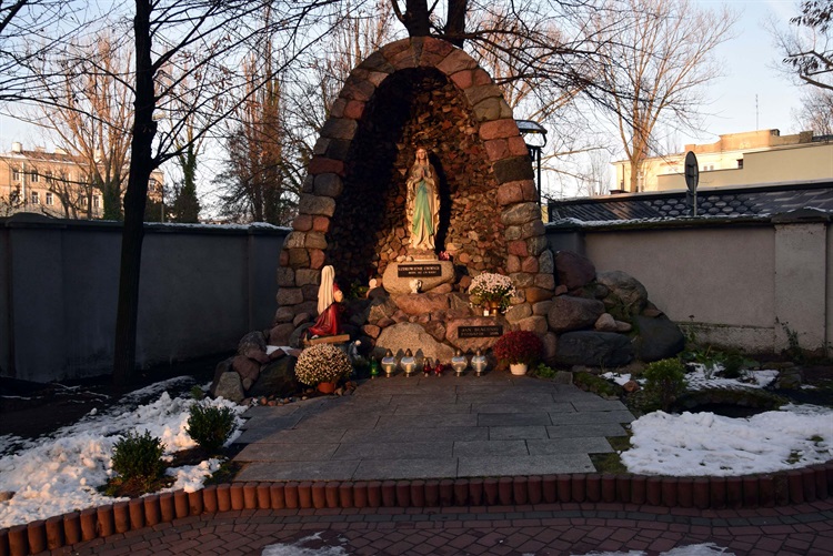 Grota Matki Bożej z Lourdes znajdująca się na terenie Sanktuarium Matki Bożej księży Marianów (Szwedzka róg Równej) z Lourdes przy kościele o tym samym wezwaniu. Data wystawienia - 2005.