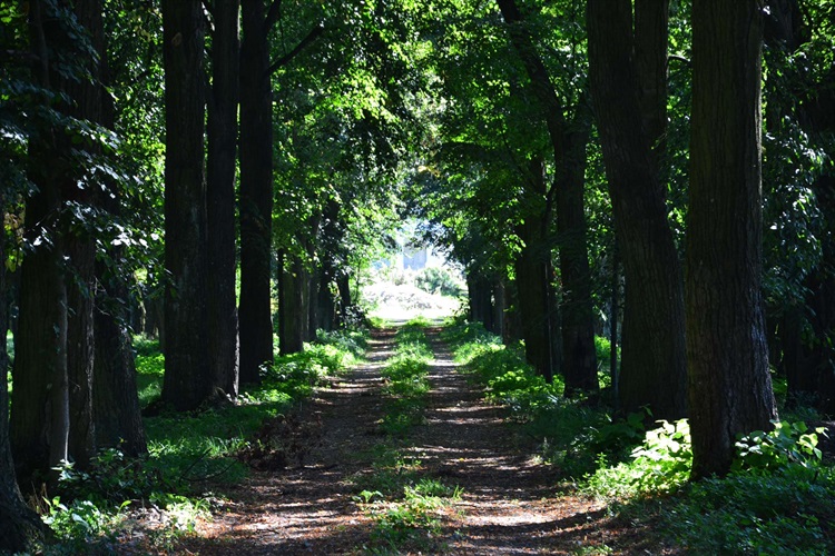 Budynek niewidoczny nawet z dalszej odległości tj. od bramy, gdyż zasłaniają go drzewa wzdłuż alei wjazdowej oraz krzewy bezpośrednio przed nim.