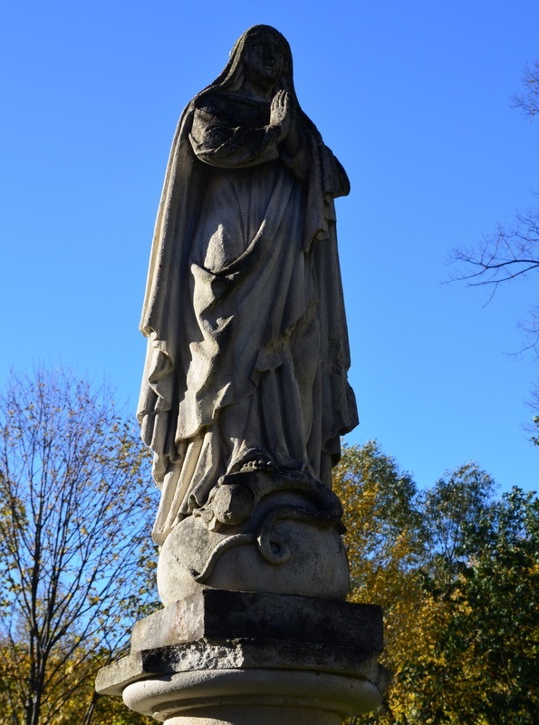 Obok byłej cerkwi św. Paraskewii, a obecnie kościoła rzymskokatolickiego stoi wykonana z piaskowca kolumna Maryjna. Kolumna prawdopodobnie pochodzi z końca XIX wieku tj. z czasów budowy świątyni. Rzeźba Matki Boskiej Niepokalanego Poczęcia stoi na kuli ziemskiej depcząc łeb piekielnego węża trzymającego w szczękach jabłko. Kula ziemska, na której stoi MB ma symboliczne znaczenie. Oznacza bowiem cały świat i wszystkich mieszkających ludzi, a Matka Boża jest królową wszechświata i Matką wszystkich ludzi.