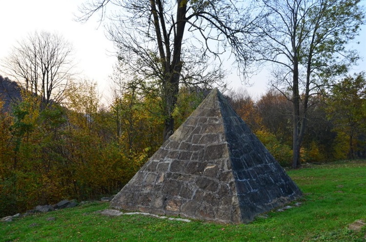Grobowiec w kształcie piramidy znajduje się na przykościelnym cmentarzu. Jest to grobowiec rodów Kulczyckich i Dobrzańskich herbu Sas. Został wykonany z bloków piaskowca, ma 3 m wysokości i jest repliką piramidy Cheopsa, będąc jej modelem wykonanym w skali 1:50. Grobowiec w kształcie piramidy wykonano wg projektu Iryny Dobriańskiej, która była jego siostrzenicą. Na płycie zamykającej dostęp do grobowca umieszczone są inskrypcje w językach polskim i ukraińskim, a nad płytą umieszczony jest krzyż maltański.