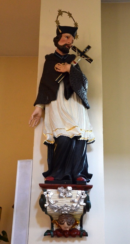 W nowym, murowanym kościele pw. Narodzenia Najświętszej Marii Panny, na zdobionej motywami roślinnymi i główką putta przyściennej konsoli stoi drewniana polichromowana figura św. Jana Nepomucena. Rzeźba umieszczona została w pobliżu konfesjonału, wszak jest on między innymi patronem spowiedników i spowiadających się. Święty przedstawiony jest w pozycji stojącej w lekkim kontrapoście z lewą ręką przyciskającą do piersi krzyż i aureolą nad głową.